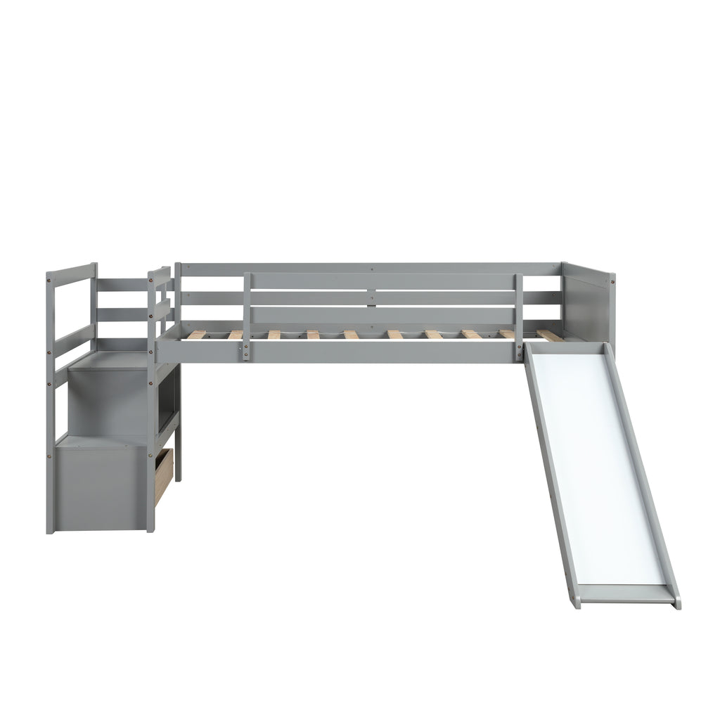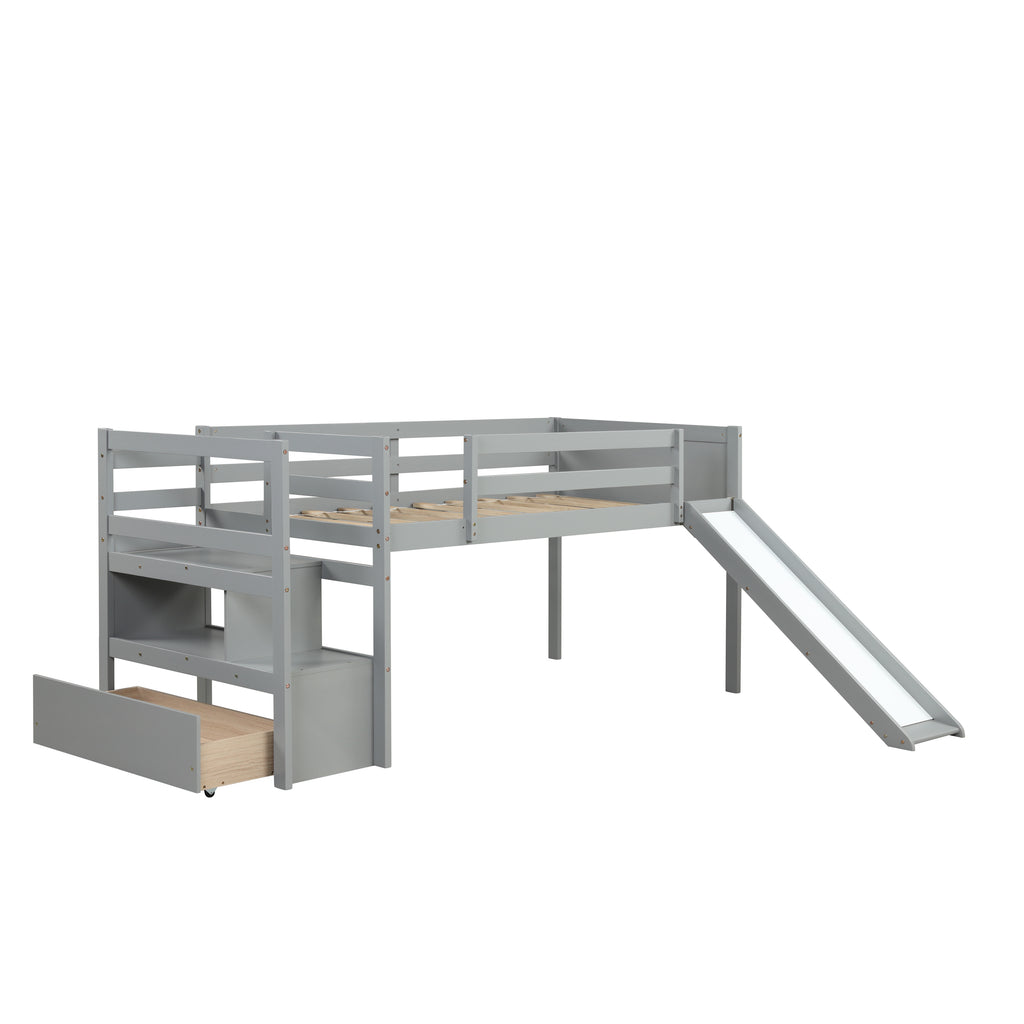 - [Multiple Functional Bunk Bed]: This low loft bed is featured a built-in stair and slide for children to have fun and develop their sense of balance and coordination. Moreover, this loft bed has a compartment and a drawer underneath the staircase taking full advantage of space to store clothes, bedding, and others.