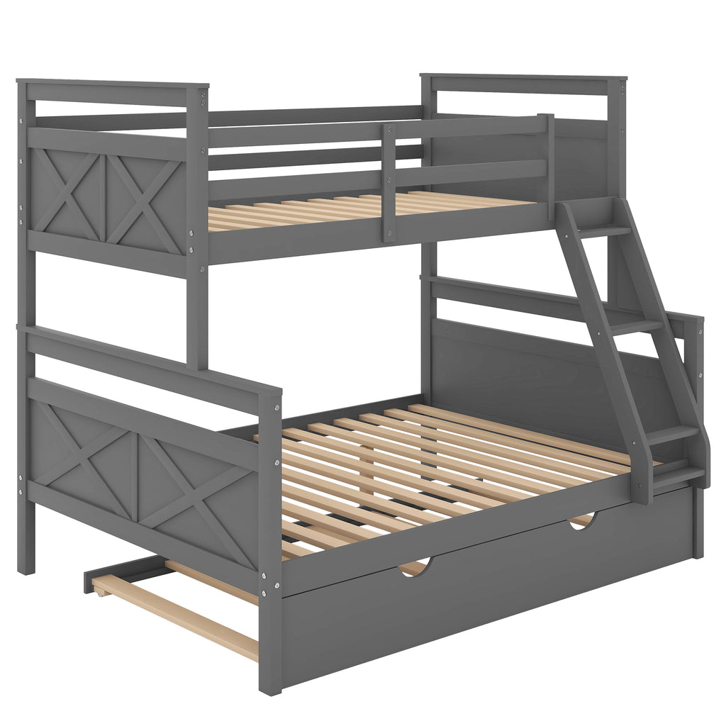 Twin over Full Bunk Bed with Ladder, Twin Size Trundle, Safety Guardrail, Gray
