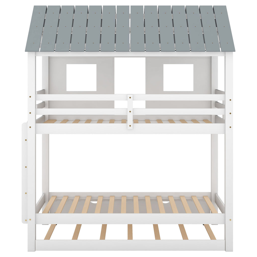 Twin Size House Bunk Bed With Trundle, Roof And Windows - White / Gray