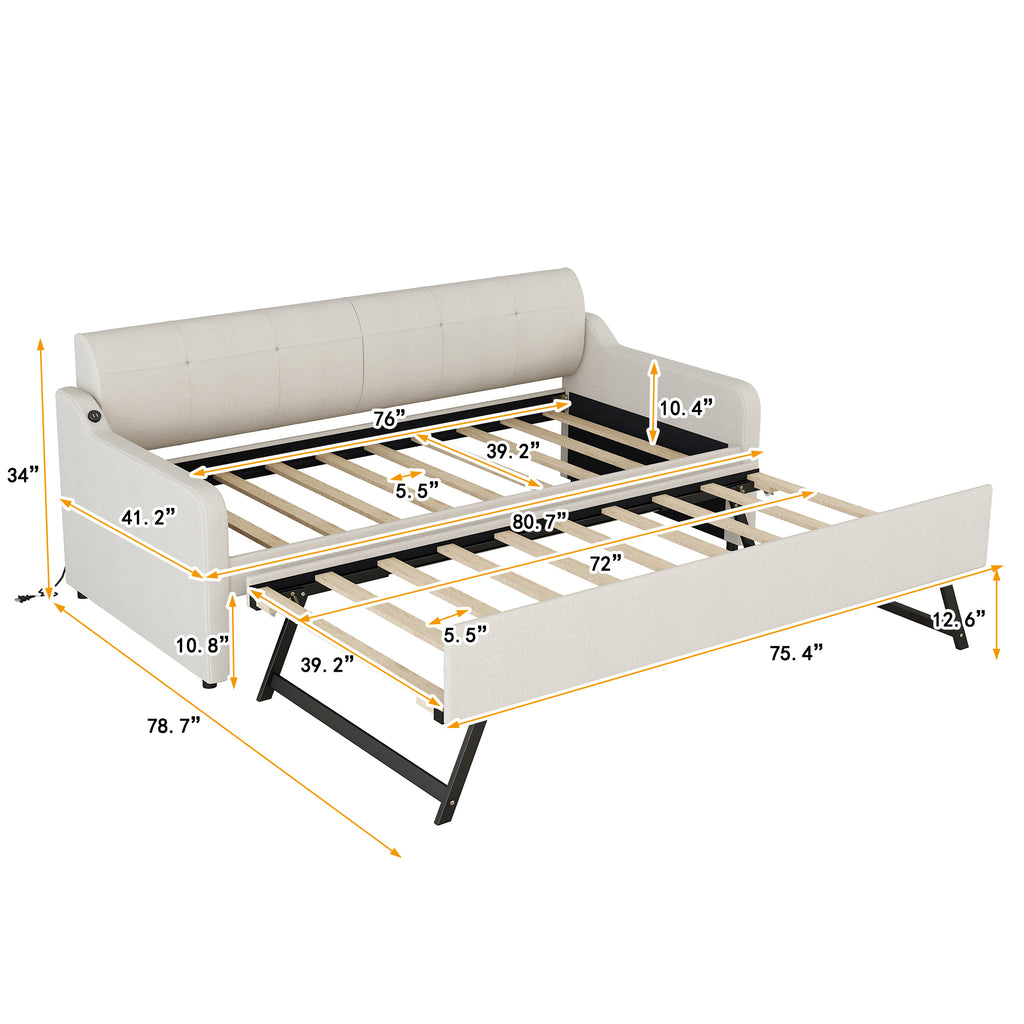 Twin Size Upholstery Daybed with Trundle and USB Charging Design,Trundle can be flat or erected,Bei