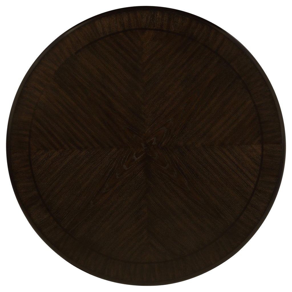 Create a stylish and functional dining area with this transitional round dining table. Featuring a spacious 60-inch tabletop in a rich, dark cocoa finish, this table makes a striking centerpiece for any dining room. The pedestal base includes two drawers for storing essentials and an open bottom shelf, perfect for displaying decor or keeping items within reach. With enough room to comfortably seat six, this elegant piece is ideal for both everyday meals and more formal gatherings, making it versatile enough for any occasion.