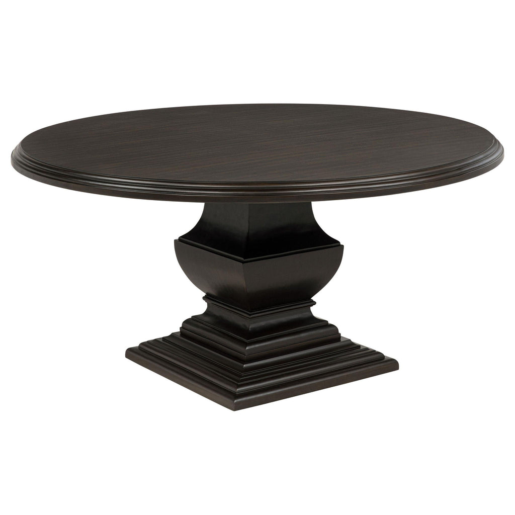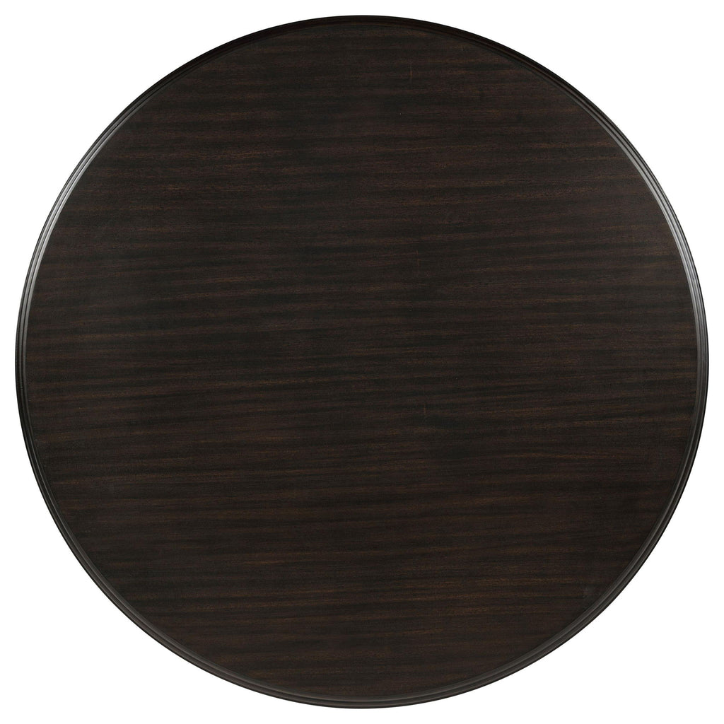 A commanding presence meets graceful symmetry in this round dining table, designed to anchor formal gatherings with timeless elegance. The expansive tabletop rests on a tiered pedestal base that echoes classical architectural forms, all wrapped in a rich dark cocoa finish. Crafted from rubberwood veneer, engineered wood, and solid rubberwood, this table balances dramatic style with lasting strength—ideal for traditional or transitional dining settings.