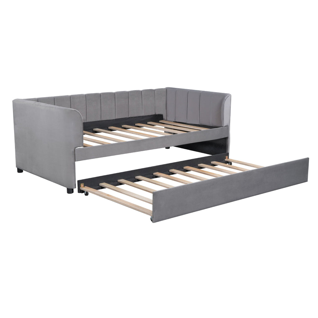 Twin Size Upholstered Daybed With Ergonomic Design Backrest And Trundle - Gray