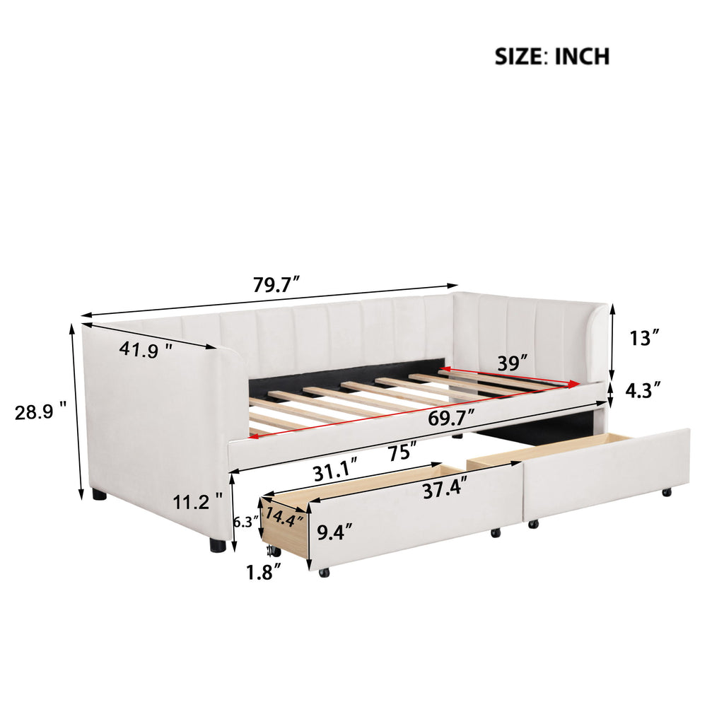 Twin Size Upholstered Daybed With Ergonomic Design Backrest And 2 Drawers - Beige