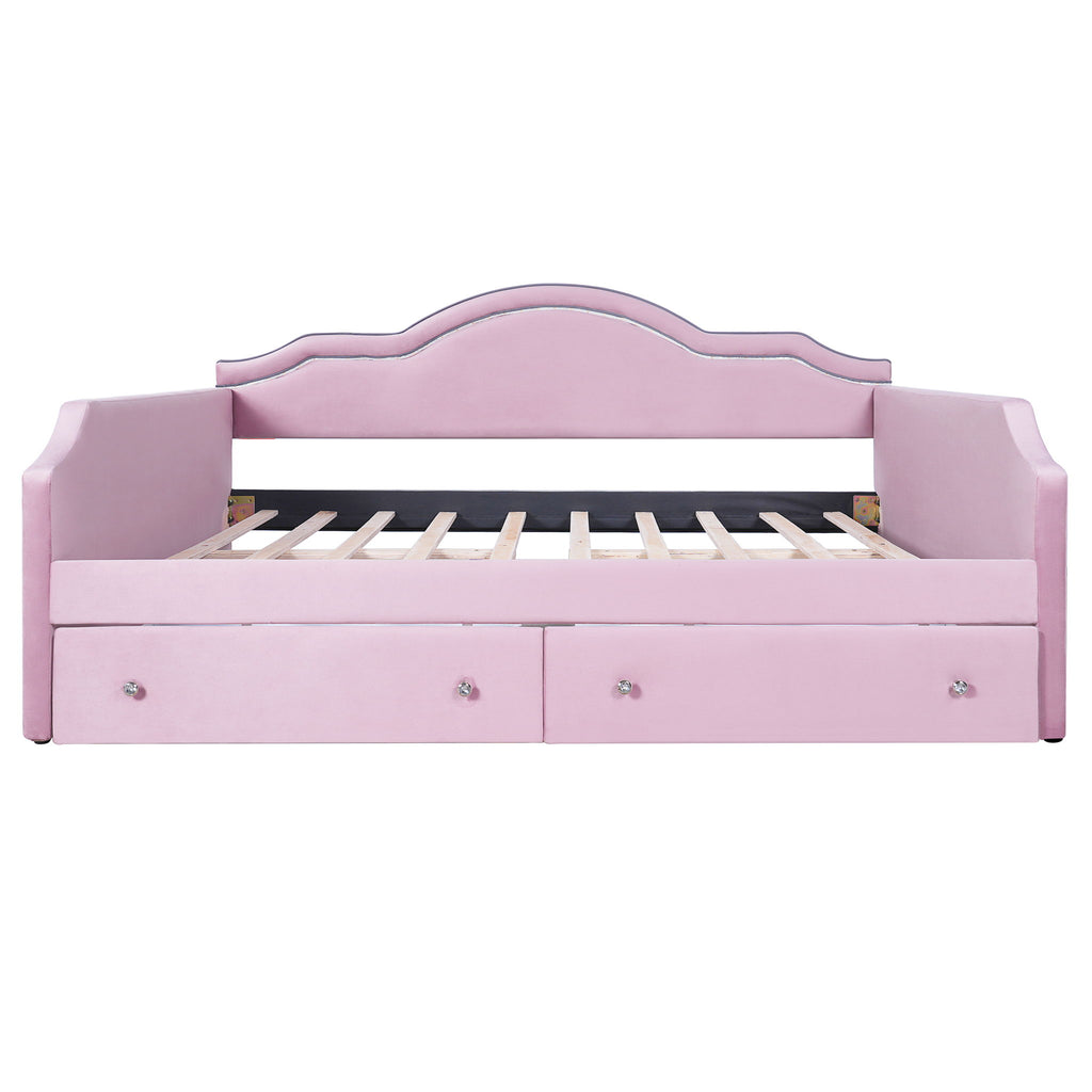 Twin Size Upholstered Daybed With LED Lights And 2 Drawers - Pink