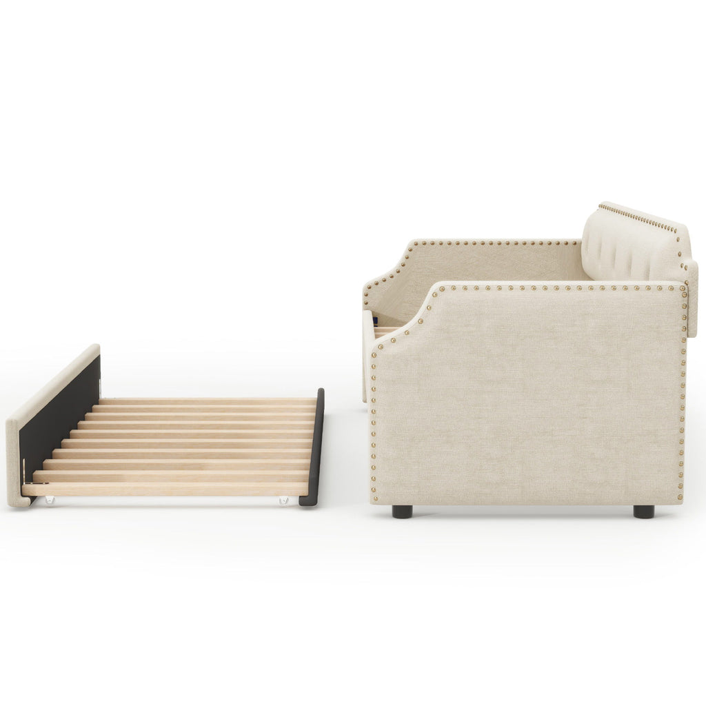 Upholstered Daybed With Trundle, Twin, Slat Support - Beige