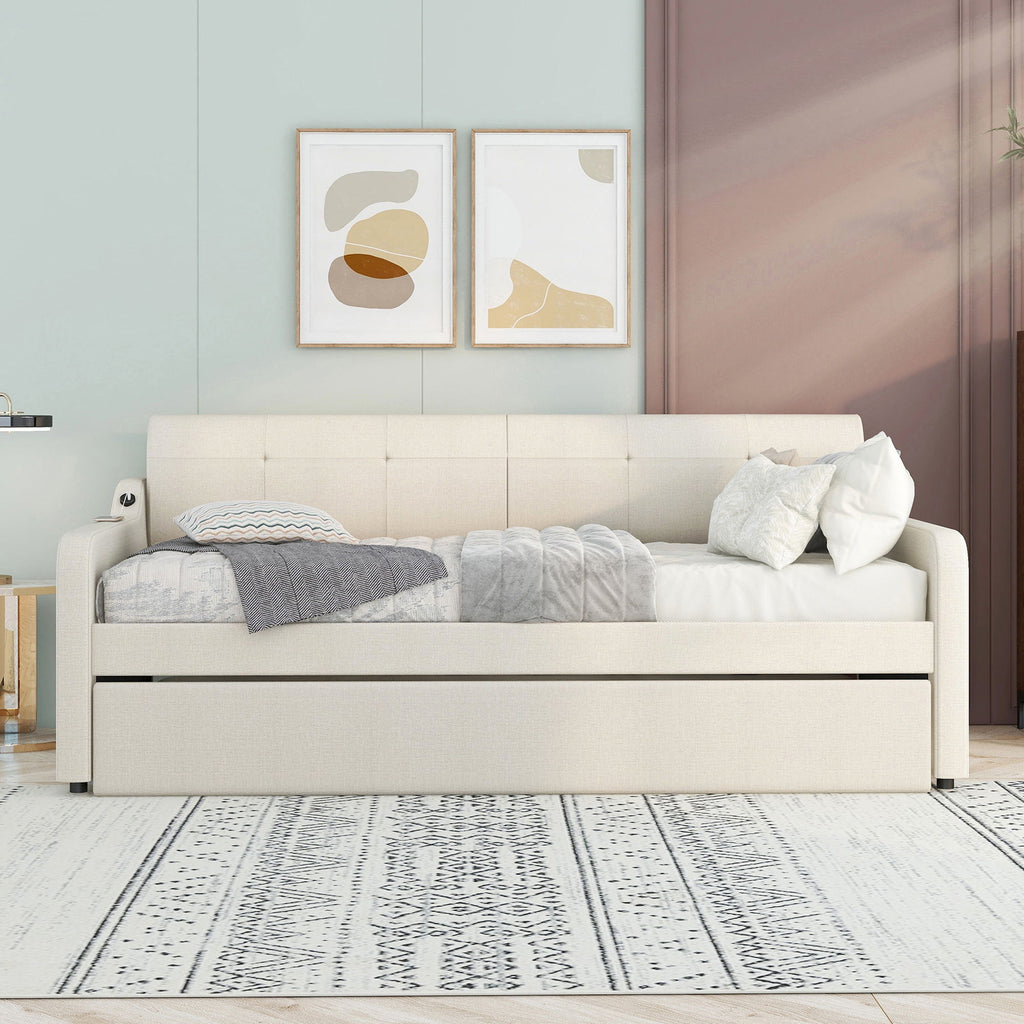 Twin Size Daybed With Trundle And USB Charging - Beige