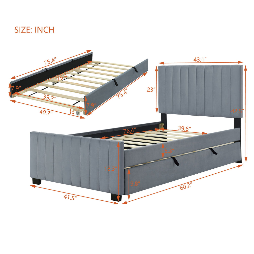 Twin Size Upholstered Platform Bed With Twin Size Trundle - Gray