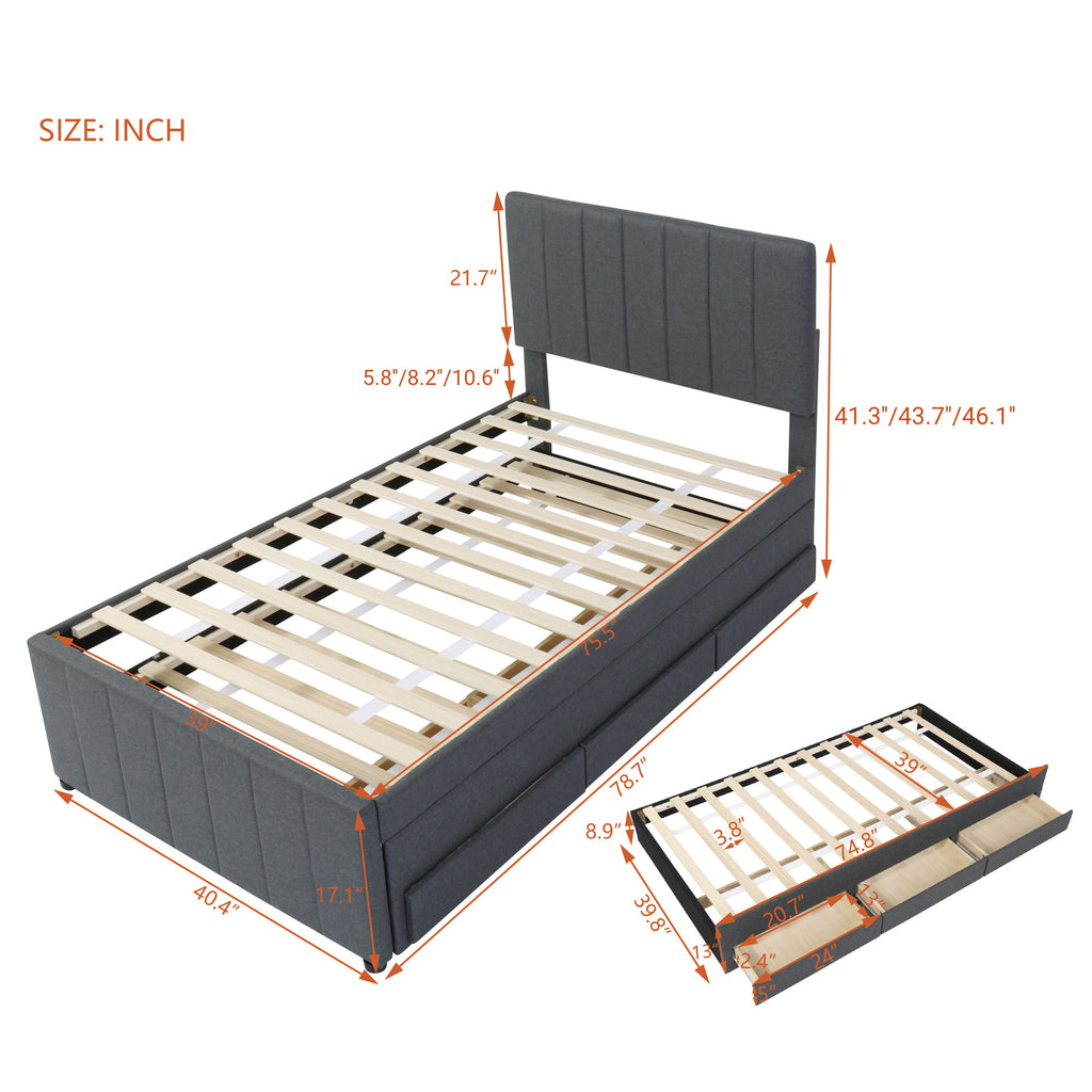 Twin Size Upholstered Platform Bed With Trundle And 3 Drawers - Gray