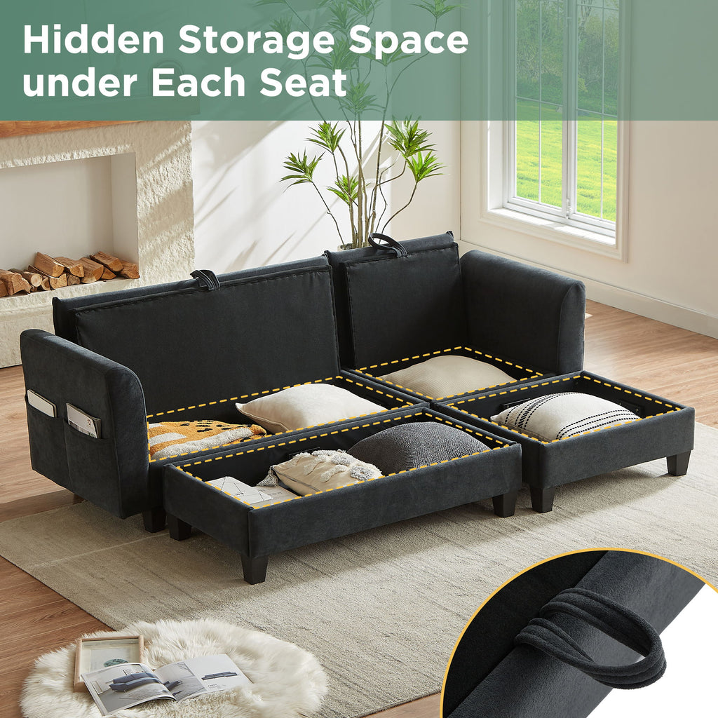 Upholstered L Shaped Sectional Sofa With Storage, Movable Ottoman, And 6 Throw Pillows - Black