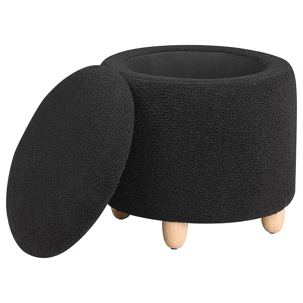 Nestled atop subtle, natural brown rounded wood feet, this round storage ottoman is a stylish statement of comfort and practicality. Upholstered in a soft faux sheepskin, it beckons with tactile appeal, inviting a moment of relaxation. The removable top uncovers a hidden compartment, perfect for stowing away books, throws, or other living essentials. Whether used as a chic accessory, a cozy footrest, or secret storage, this ottoman is a versatile addition to your home decor.