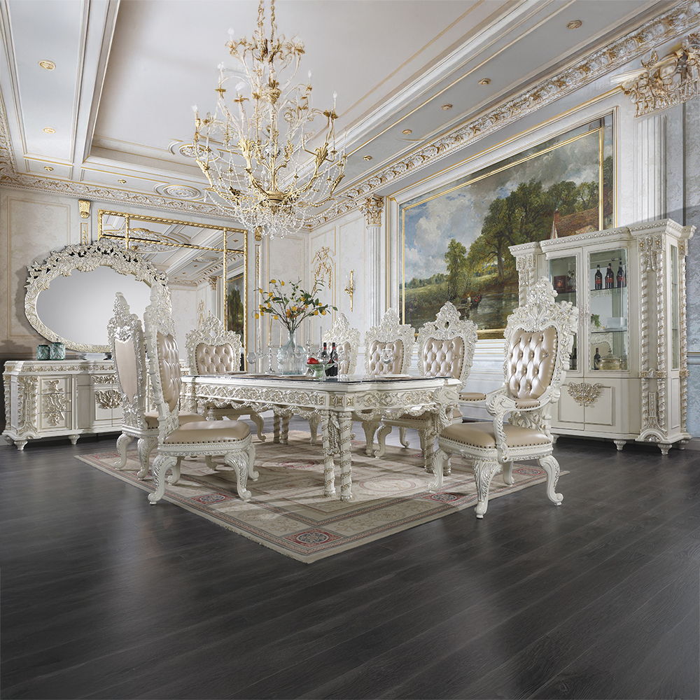 Luxurious style, sophisticated charm, and lustrous finishes are all included in the Vanaheim Bedroom Collection. Extravagant scroll floral design with gold trim accent creates classic appeal and timeless silhouettes. Button tufted headboard and footboard add texture and dimension to the panel bed. The matching casegoods in an antique white finish echo the overall design of the collection.'With so many irreplaceable characters, the Vanaheim Bedroom Collection will work beautifully in a variety of other spaces.