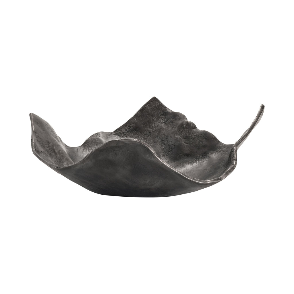 The Crestview Collection Vaughn Large Charger Tray is made of aluminum with a black and gray finish. This conceptual piece of art has no two sides exactly the same. The waves along the edges guide you along to a blunt end. The depth of the tray varies and there is no large flat space, making this tray best suited as a display piece on a shelf or console.