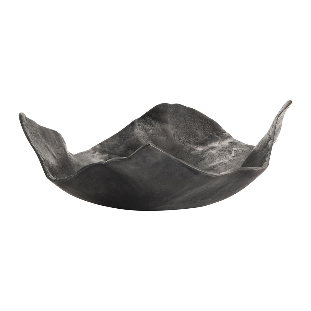 The Crestview Collection Vaughn Medium Charger Tray is made of aluminum with a black and gray finish. This conceptual piece of art has no two sides exactly the same. The waves along the edges guide you around the piece. The depth of the tray varies and there is no large flat space, making this tray best suited as a display piece on a shelf or console.