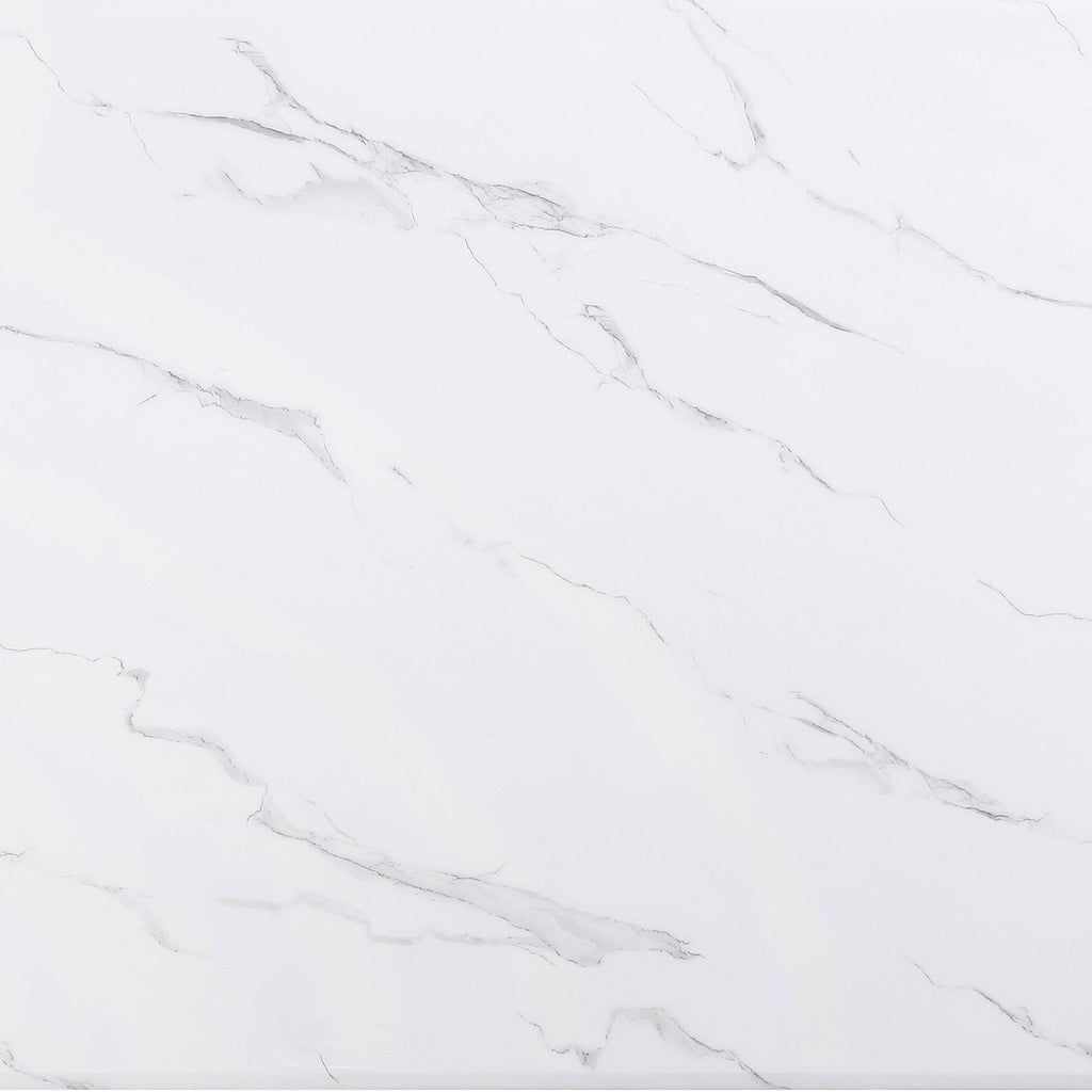 Elevate your dining room with the essence of modern luxury embodied in this white and grey marble veneer dining table. The table, constructed with engineered marble veneer, china white marble, and MDF, features a gleaming white marble table top adorned with intricate patterns and veining, adding a sense of dimension and texture. The gold finished crisscross stainless steel legs not only provide sturdy support, but also offer a touch of luxury and contemporary style.