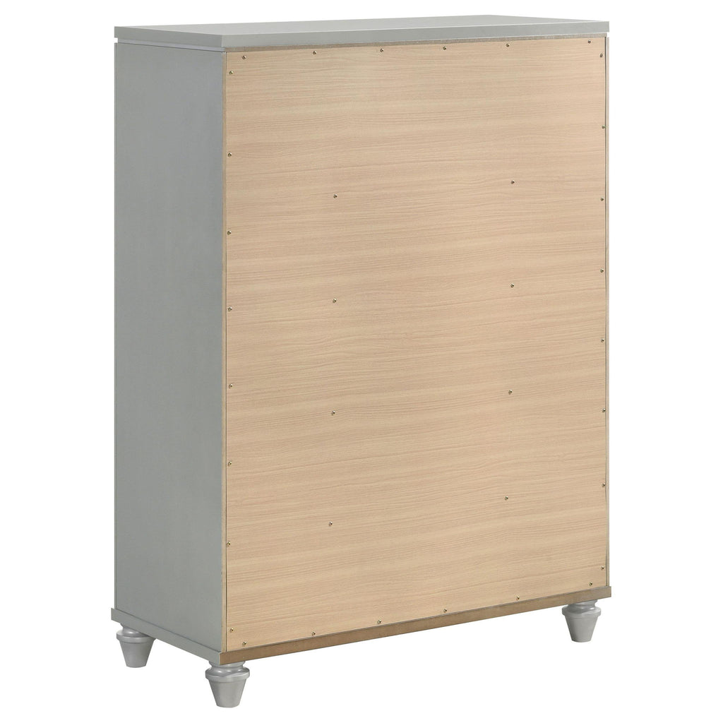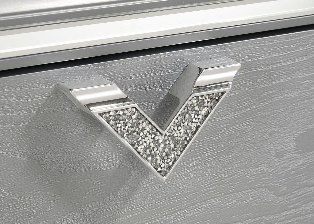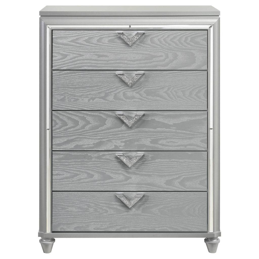 Instill a sense of sophistication with a modern glam five-drawer chest in your bedroom. Offering exceptional storage with a compact footprint, the chest features a light silver finish with wood grain drawer fronts for a chic, refined look and feel. Drawer fronts are accented with jeweled V-shaped pulls and shiny silver trim, creating an eye-catching touch. The chest includes a black felt lining in the top drawer, protecting delicate items and electronics. Turned style feet complete the look with a hint of classic glamour, adding refined character in your bedroom or dressing area.