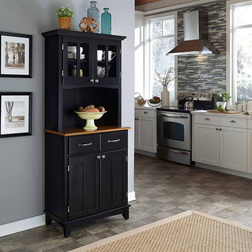 Redefine your kitchen or dining room with the luxury of the Walker Hutch by homestyles. This remarkable buffet comes with a classic design and has plenty of room for dining or kitchen essentials. This buffet features two wood-framed cabinet doors with an adjustable shelf inside and two easy glide drawers with brushed steel pulls. Two upper wood-framed glass doors with a customizable shelf inside each offer extra storage for other kitchen items. Comes carefully packaged with all items labeled and coordinating easy-to-follow assembly directions.