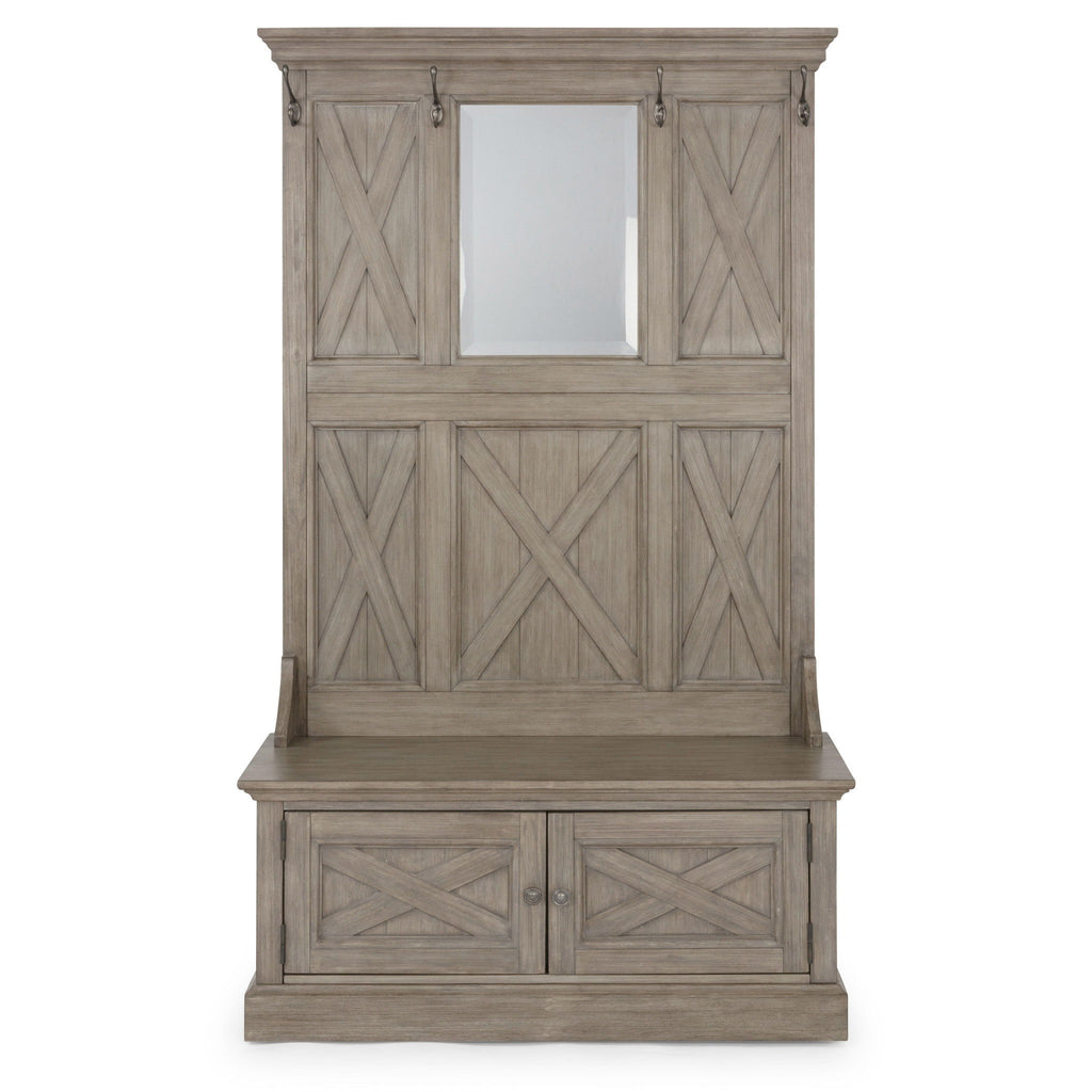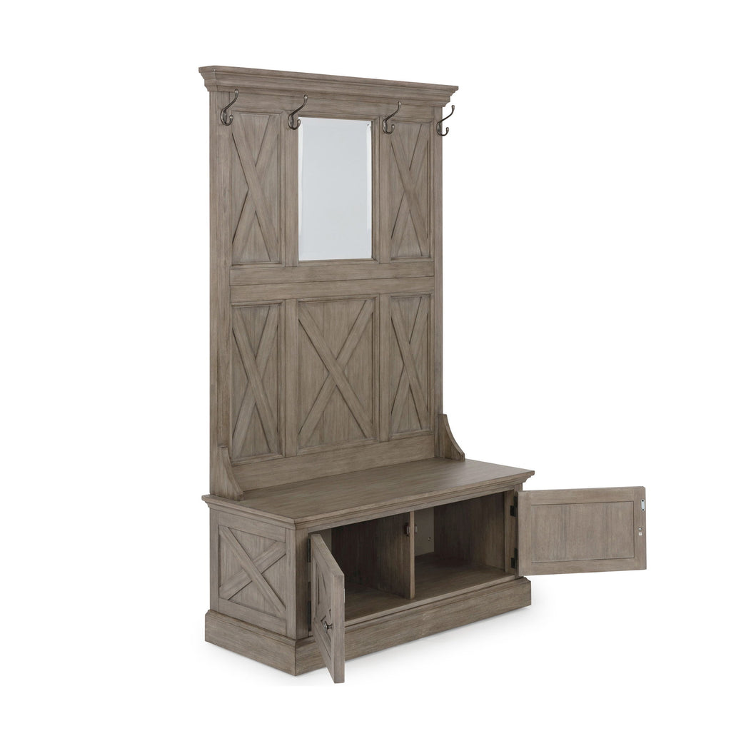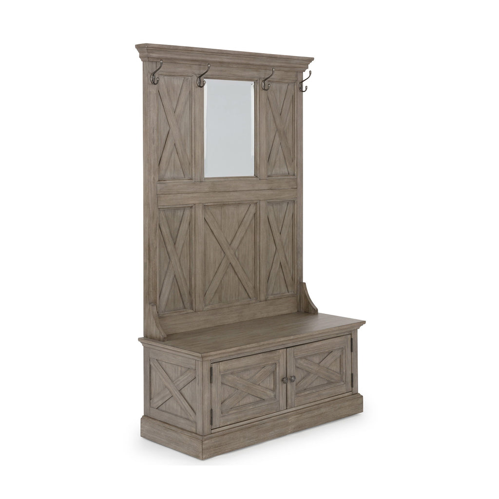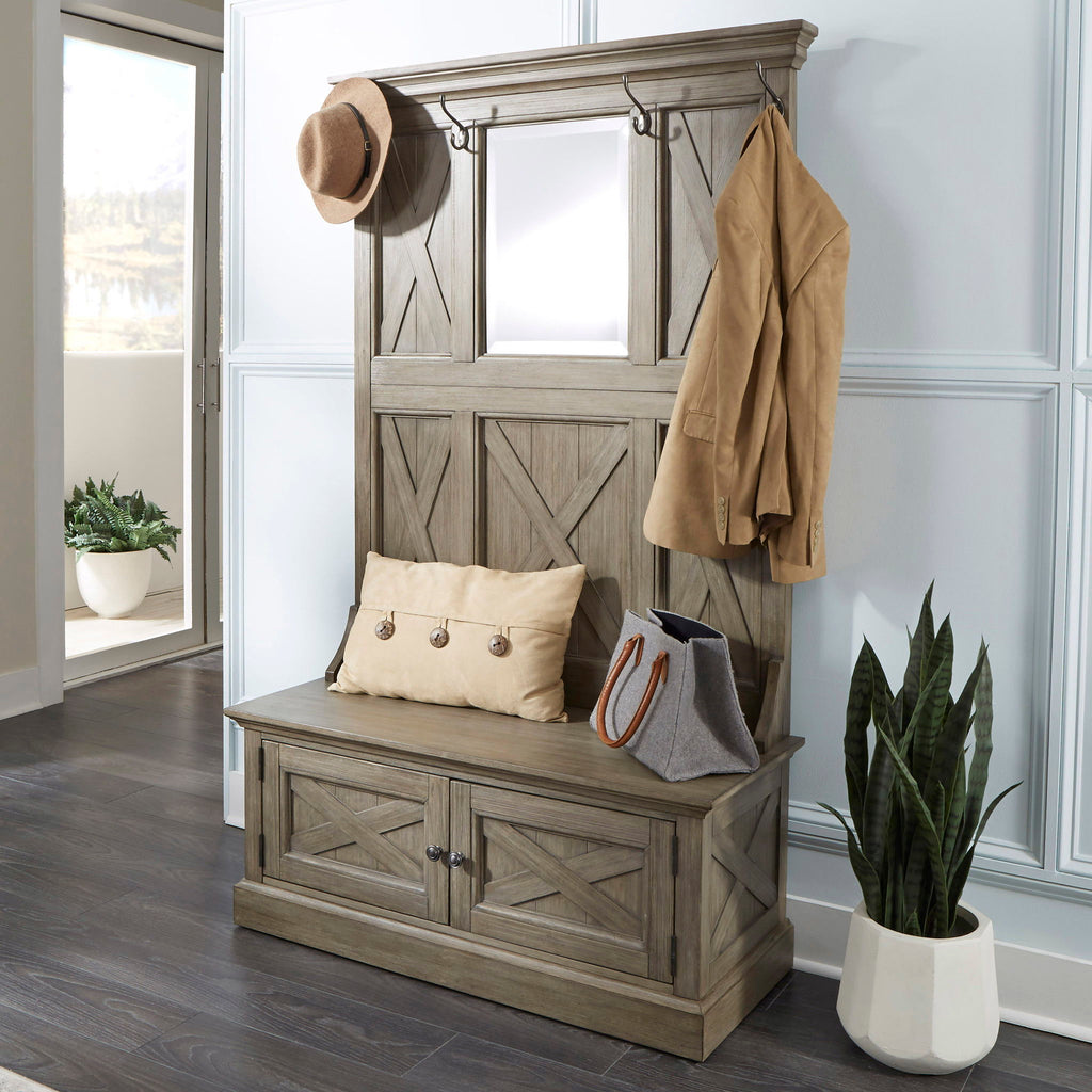- Finished in a multi-colored gray with inset wainscot panels and X frame