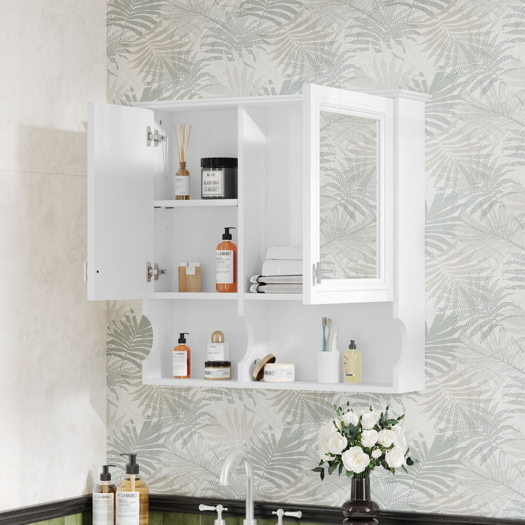 Wall Mounted Mirror Medicine Cabinet, Bathroom Storage With Doors And Open Shelves With Adjustable Shelf - White