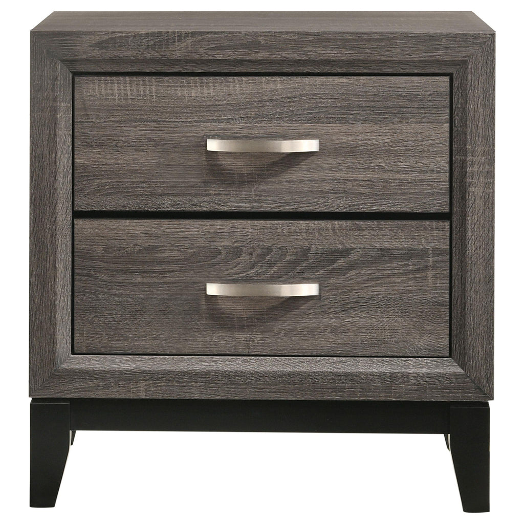 Grey is the "it" color these days, and this four-piece bedroom collection sets the pace for any master bedroom. Each piece is finished in gray oak that has a weathered appeal with contrasting black accents and frames that are understated yet bold. The eastern king bed has an imposing headboard and low-profile footboard with black-accented rectangular paneling. The handsome nightstand and dresser each have roomy drawers with silvery accented handles that impart a touch of brilliance. The matching mirror has clean, crisp lines for a perfect fit atop the gorgeous dresser.
