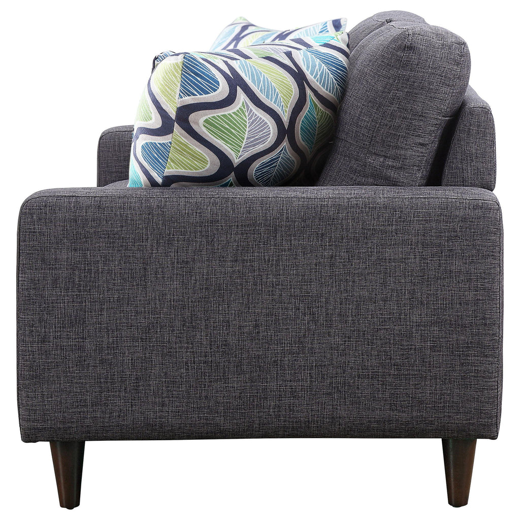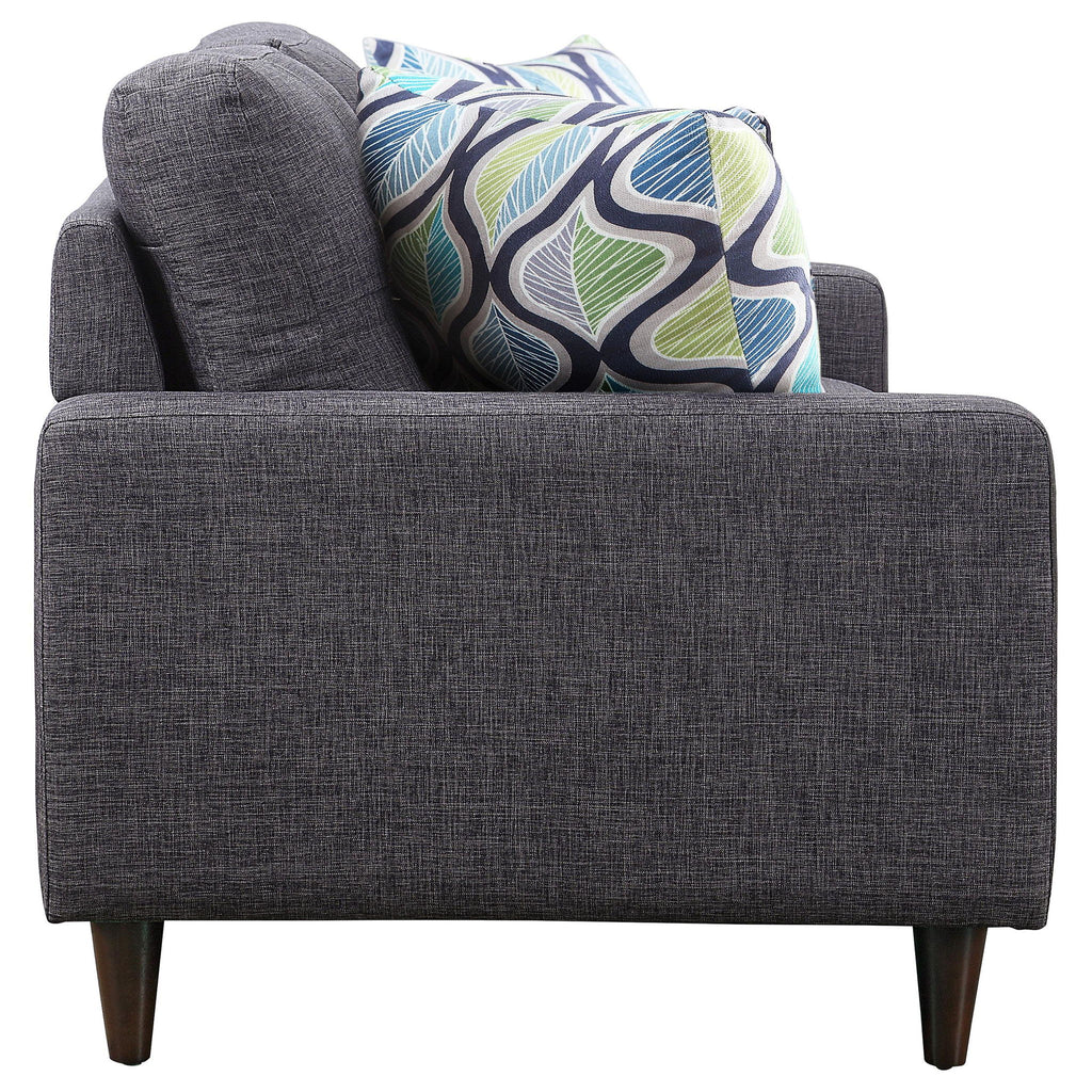 This loveseat features clean lines and cushioned comfort for hours of enjoyment. Sink into thick seat cushions for hours of watching your favorite shows or cuddling by a fire. Seat backs feature button tufting that's timeless and stylish. Loveseat also has round tapered legs and wide armrests for a solid modern appeal. Available in dark grey fabric that suits any living room decor.