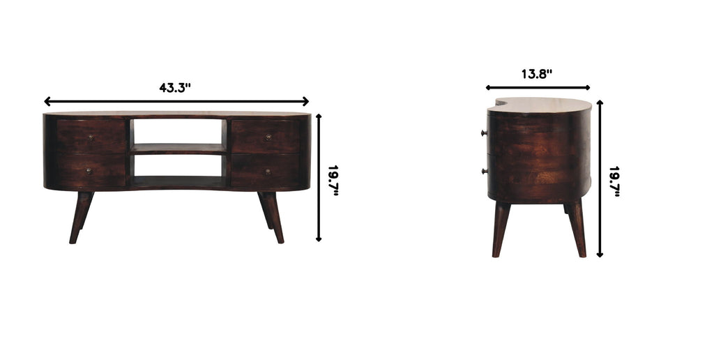 - Wave Entertainment Unit - This solid wood media unit has been constructed from 100% solid mango wood in a light walnut finish and offers a unique shaped design with rounded edges. It features four drawers that have shiny knobs and Nordic-style legs. A nice addition to the living room.