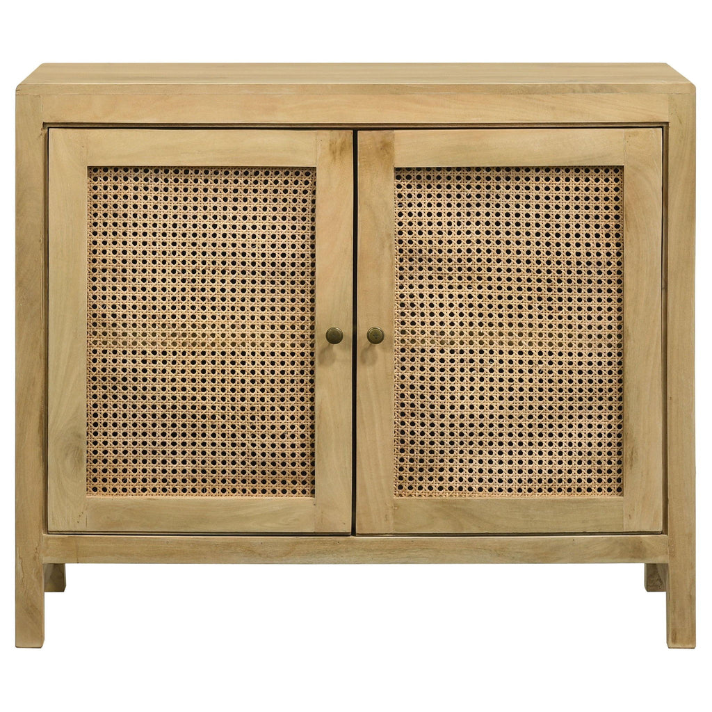 Bring warmth and texture to your space with this transitional accent cabinet, crafted from eco-friendly mango wood in a natural finish. The woven cane door panels add a touch of retro charm, while antique brass-finished hardware provides a subtle contrast. Designed for both style and functionality, this cabinet offers ample storage to keep essentials neatly tucked away. The clean lines, block-style feet, and softly rounded edges create a balanced, inviting aesthetic. Perfect for use as a sideboard, entryway cabinet, or living room storage solution.