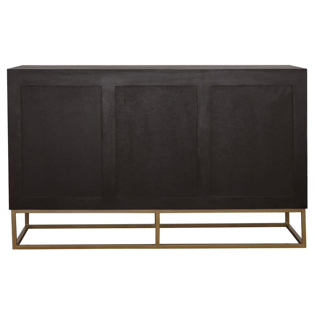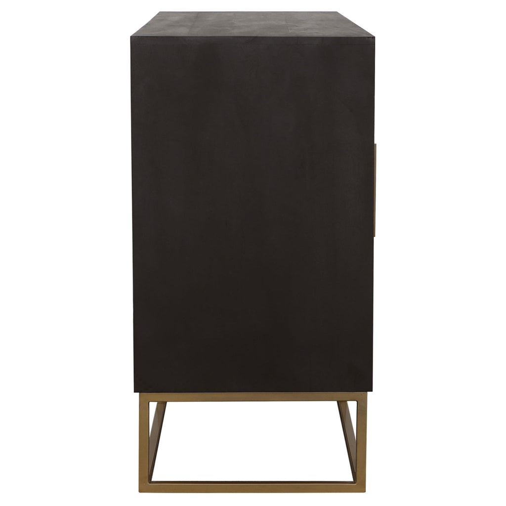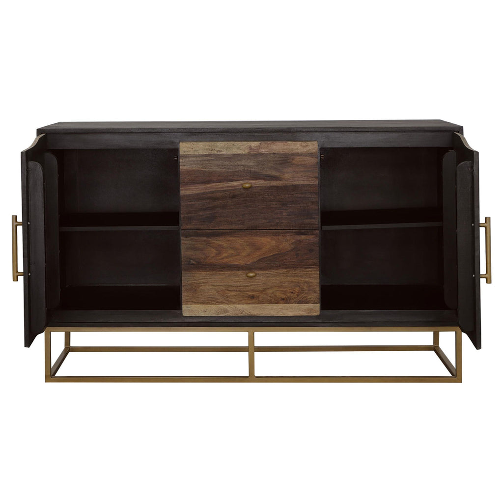 An outstanding handcrafted wood accent table from India, this piece flaunts a range of natural wood colors. Two cabinet drawers boast sleek gold bar pulls. Meanwhile, two center drawers offer additional storage space. The gold geometric base ties the entire look together. Use this piece in eclectic style living spaces.