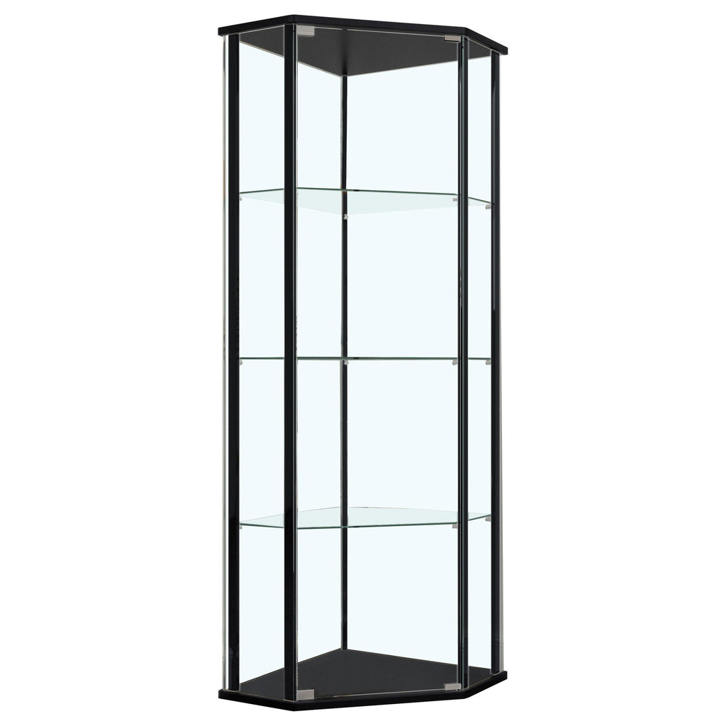 Bring your decor to elegant life with this stunning, modern curio cabinet. A triangular silhouette with cool, clipped corners adds artistic appeal to this glamorous piece. The sleek, metal supports flaunt a gleaming chrome finish. Three tiers of shelving offer elegant display space for photos and decorative keepsakes. Crafted of metal and tempered glass, this beautiful cabinet is built for superior strength and durability.
